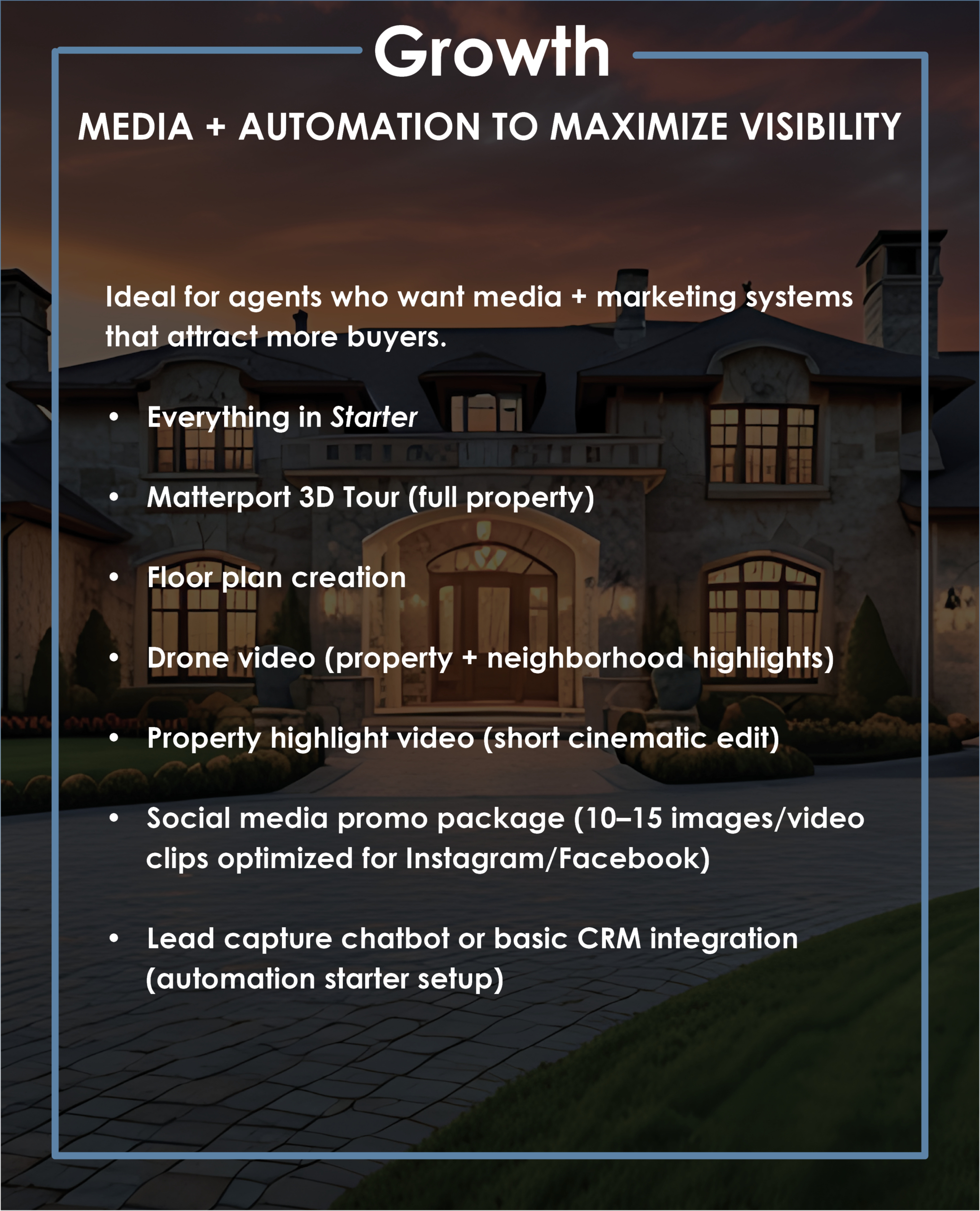 Our team blends high-end creative media with smart AI automation to give your brand both style and substance. Whether you need breathtaking property visuals, a boutique website, or a streamlined automation system that works while you sleep, we make it happen.