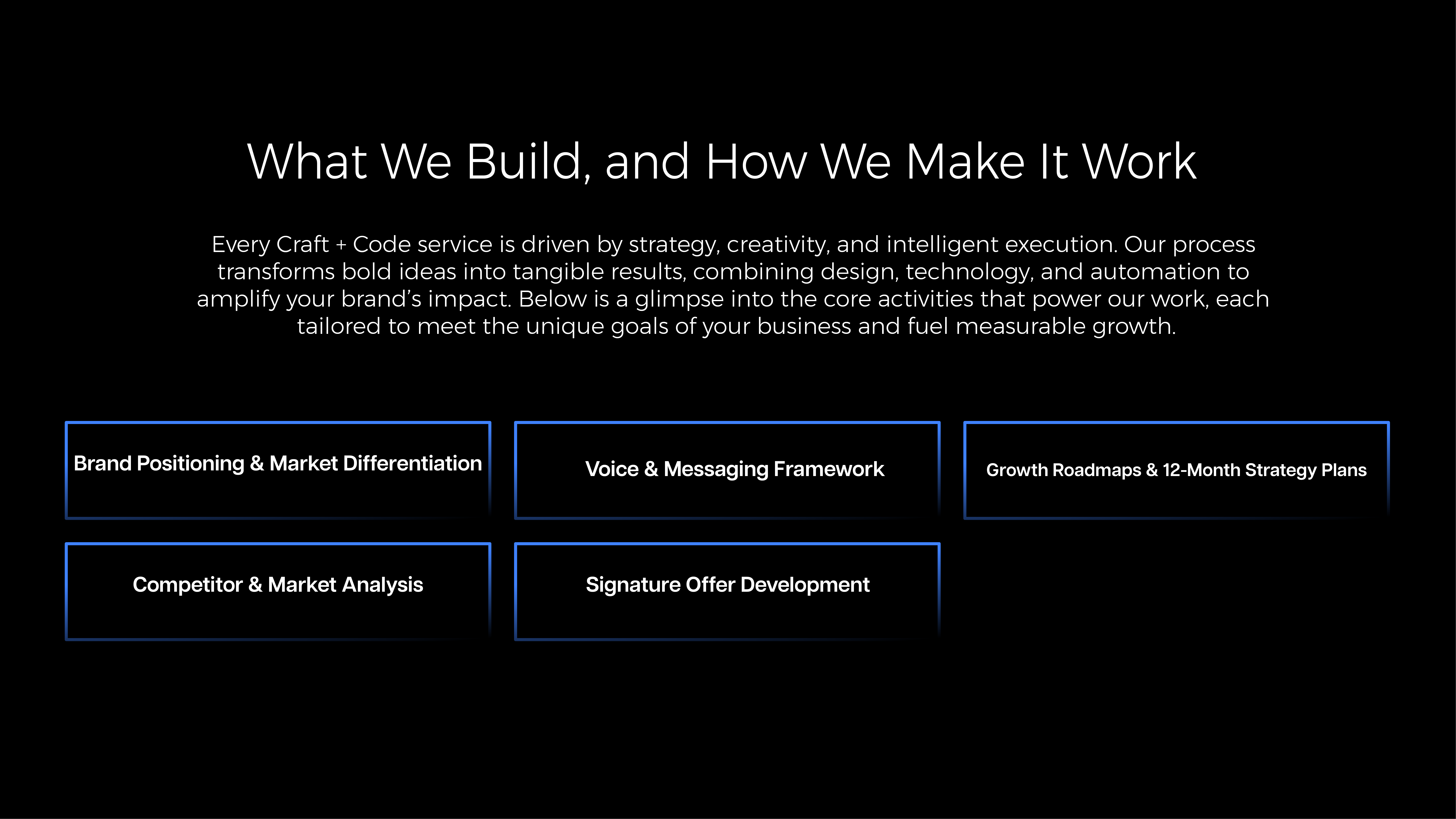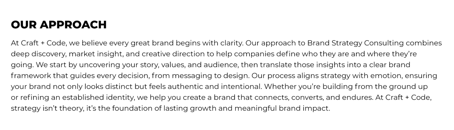 Craft + Code helps businesses define their purpose, clarify their message, and build brands that lead with confidence, blending creative insight and strategic direction to turn ideas into lasting impact.