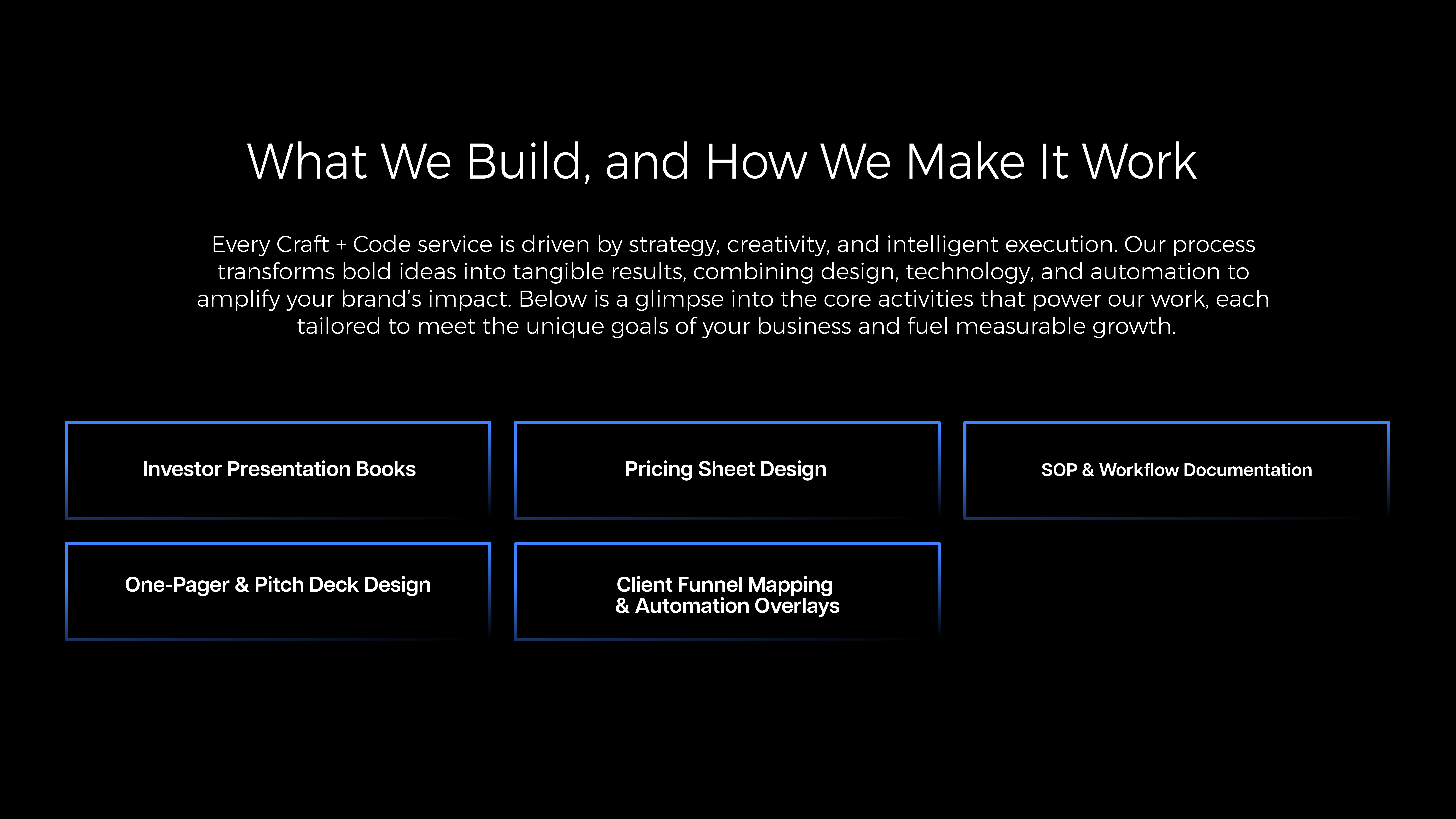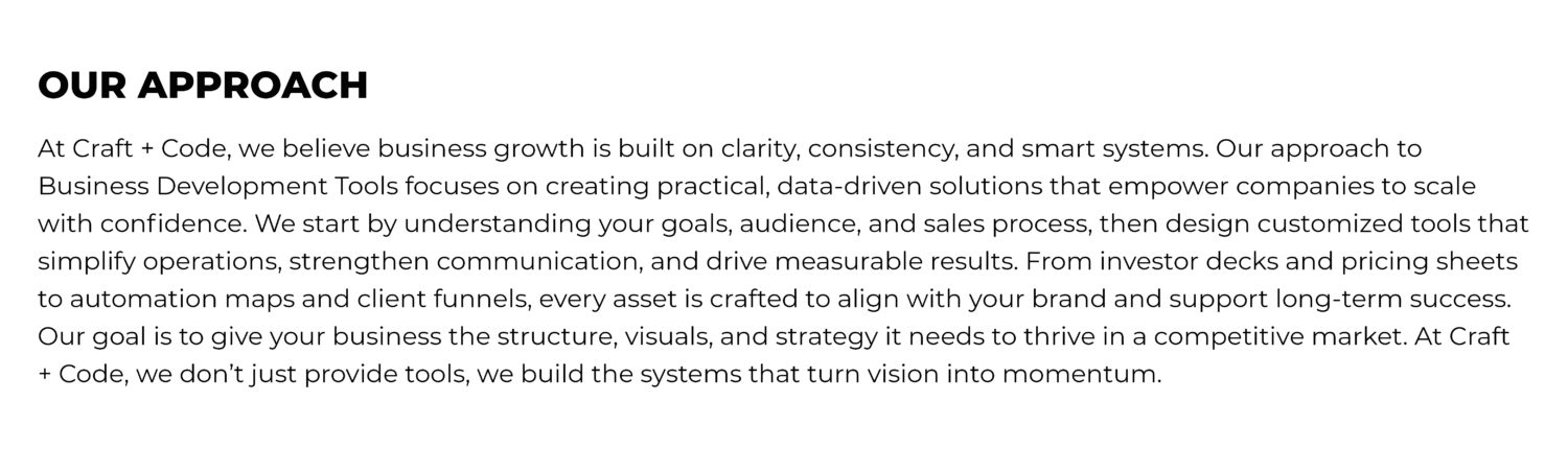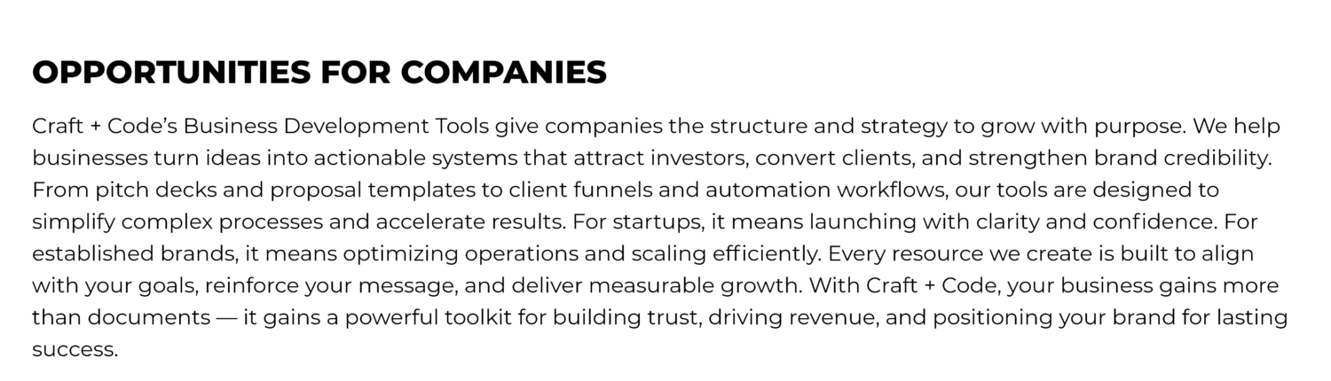Craft + Code creates powerful business development tools that turn strategy into action, helping companies attract investors, convert clients, and scale with confidence through clarity, design, and intelligent systems.