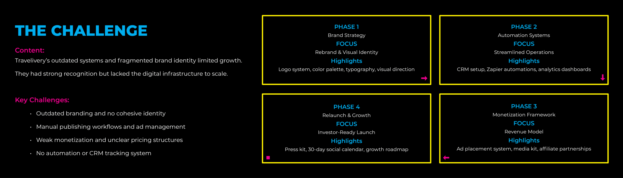 Travelivery is a Las Vegas-based digital lifestyle media brand founded by Jeremy Womack, dedicated to showcasing entertainment, dining, nightlife, and culture. After years of organic growth, Travelivery needed a total transformation—something that could reposition it as a premium lifestyle platform with scalable revenue streams and modern automation.