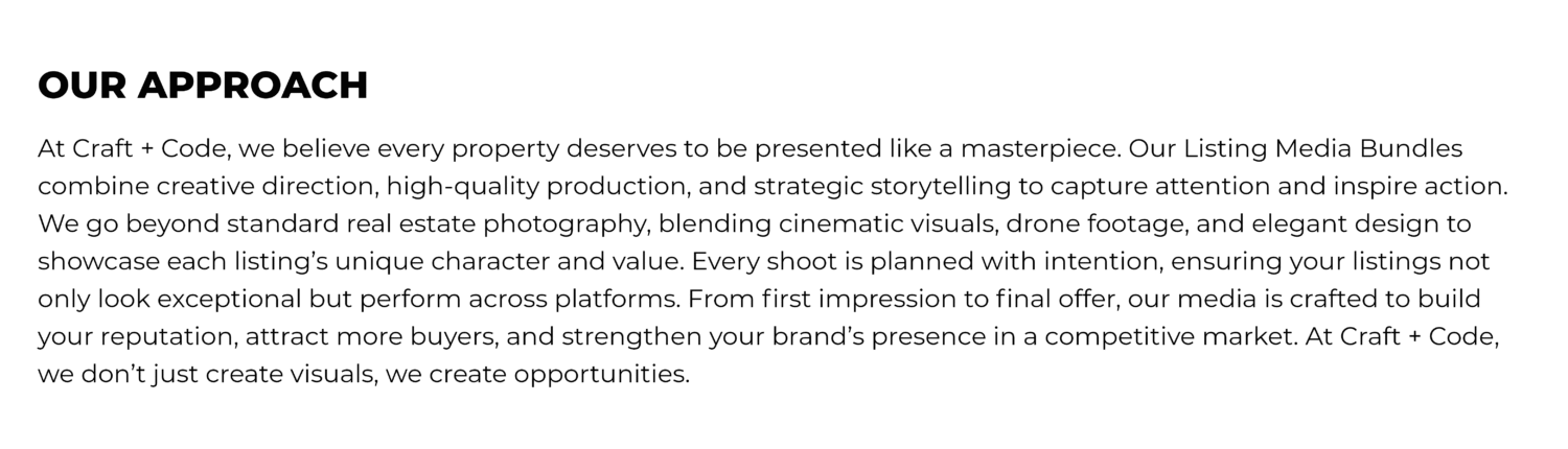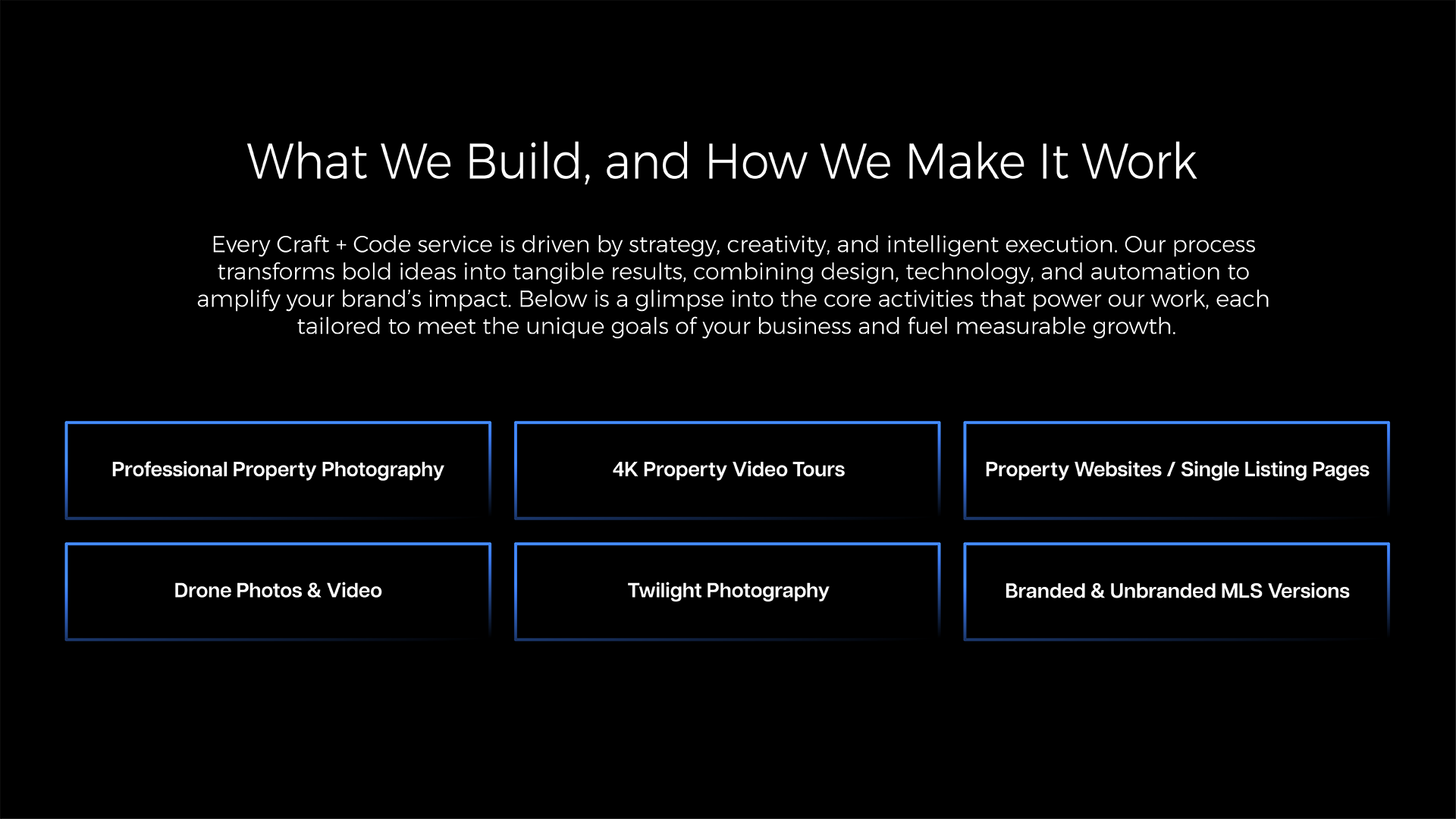 Craft + Code’s Listing Media Bundles combine cinematic visuals, professional design, and strategic marketing to capture attention, build trust, and transform every property into a powerful brand statement.
